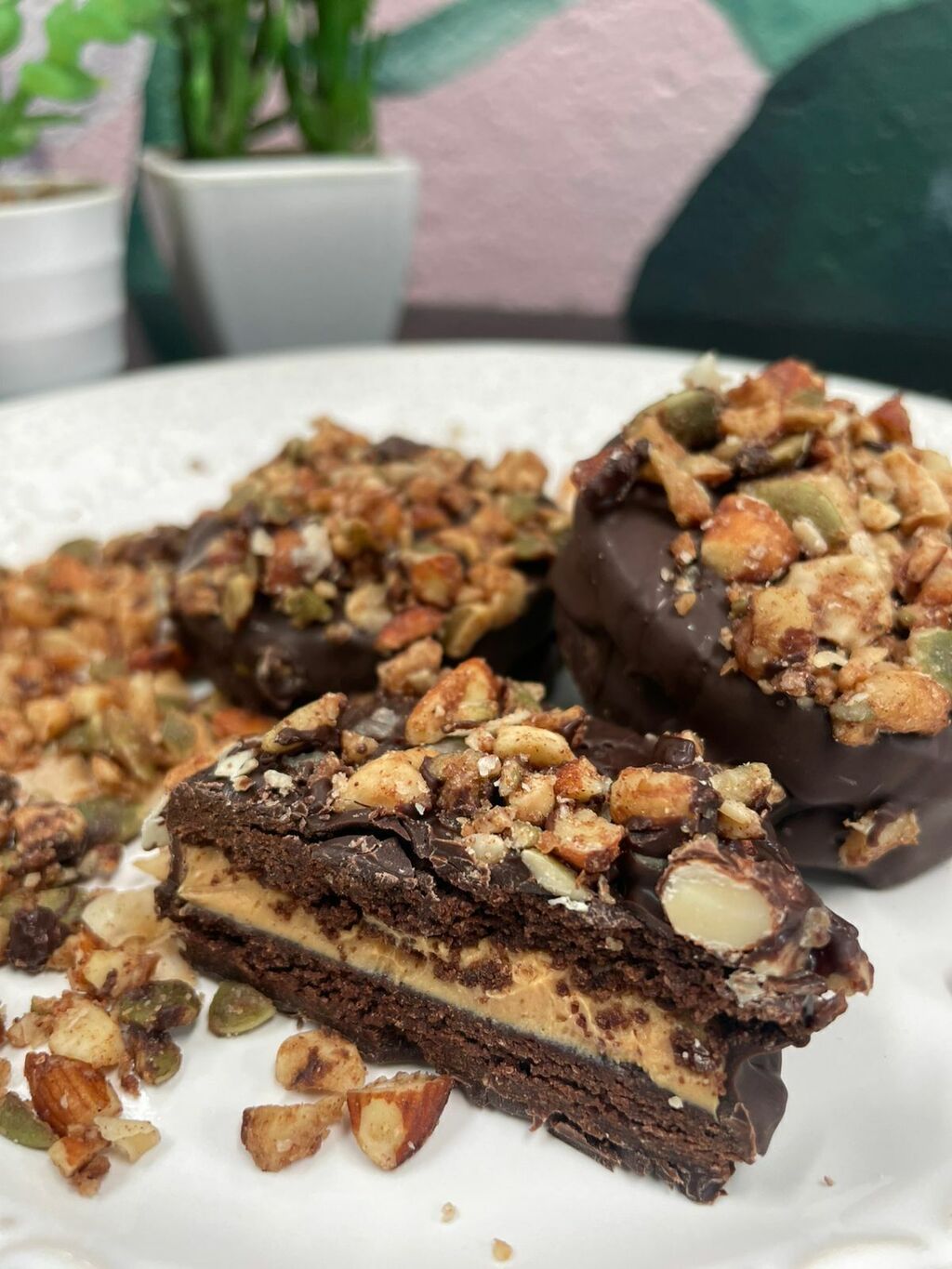 Ingredientes: Harina de almendras, manteca, eritritol, cacao amargo, harina de coco, huevo, stevia, bicarbonato de sodio, sal, dulce de leche con stevia, queso crema, chocolate 70%, aceite de coco.